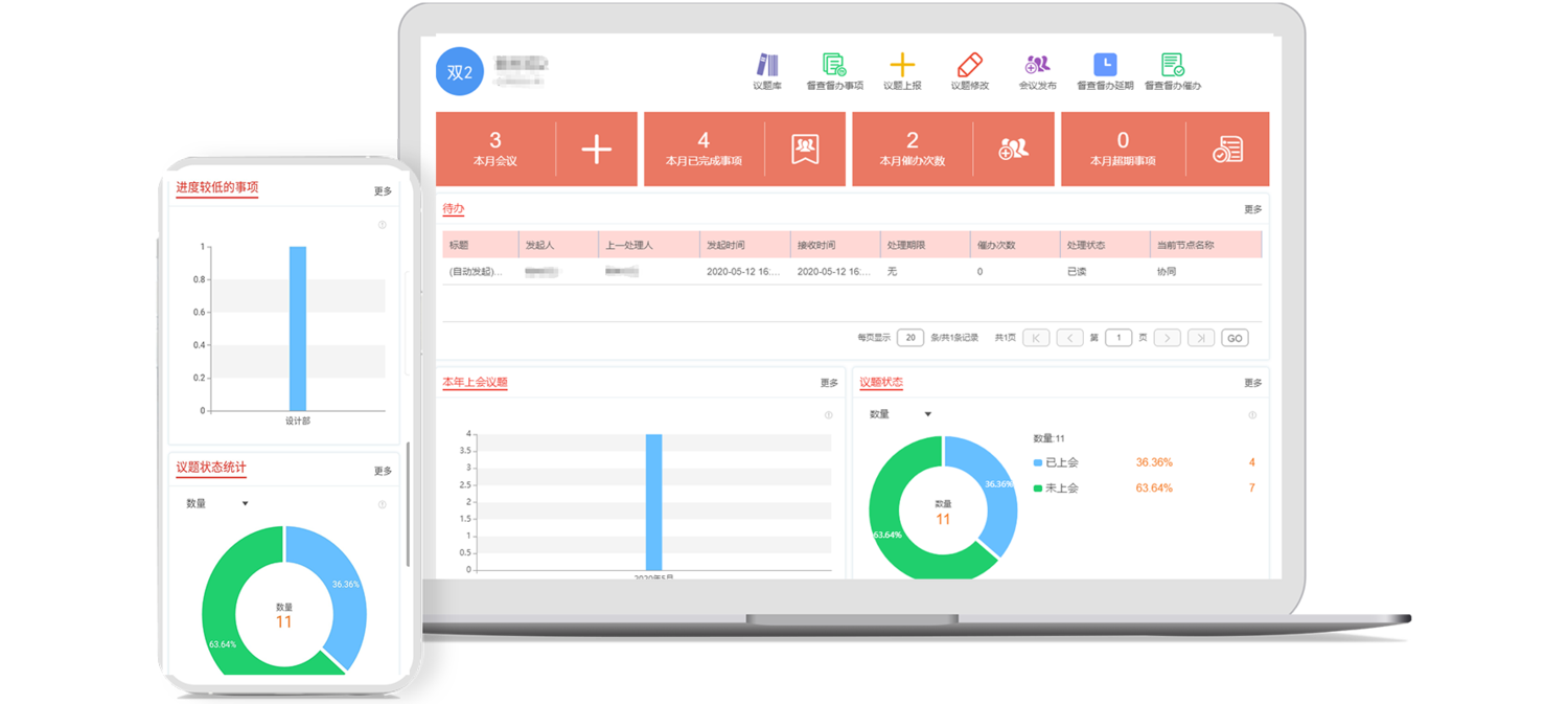 针对每位客户的会议督办管理需求,预置包括各部门会议、已完成事项、各部门延期、督办事项进度情况等统计报表,并能够按照权限进行图形化展示,事项现状一目了然。