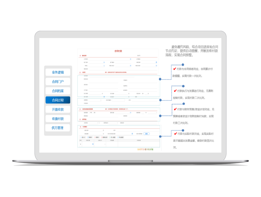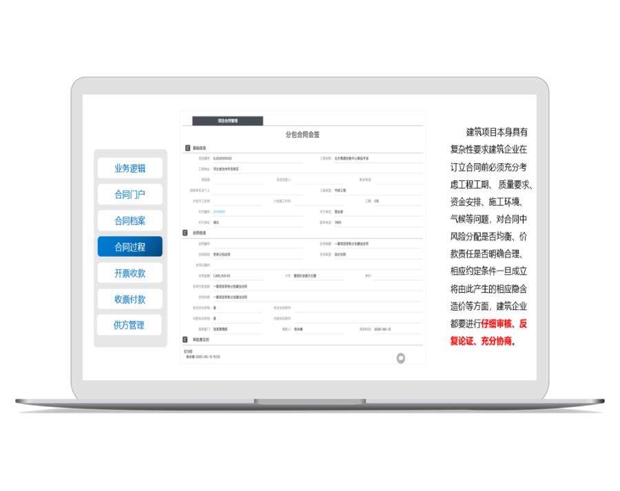 由洽谈、草拟、签订、生效,直至合同失效为止。不仅要重视签订前的管理,更要重视签订后的管理。合同与项目、分包分供方、材料、劳务等信息紧密相连,建立基于合同的主数据平台,灵活调用。