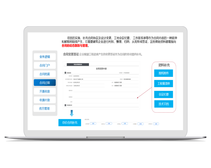 将合同变更规范化、程序化,做到实时有据可循。工程量清单、图纸附件、会议纪要、技术文档、总价合同补充等内容皆可进行详细填写。