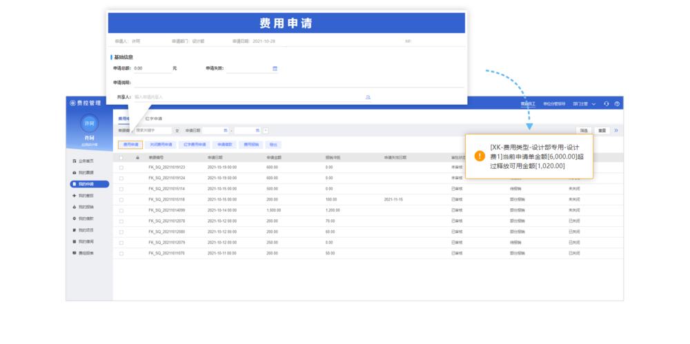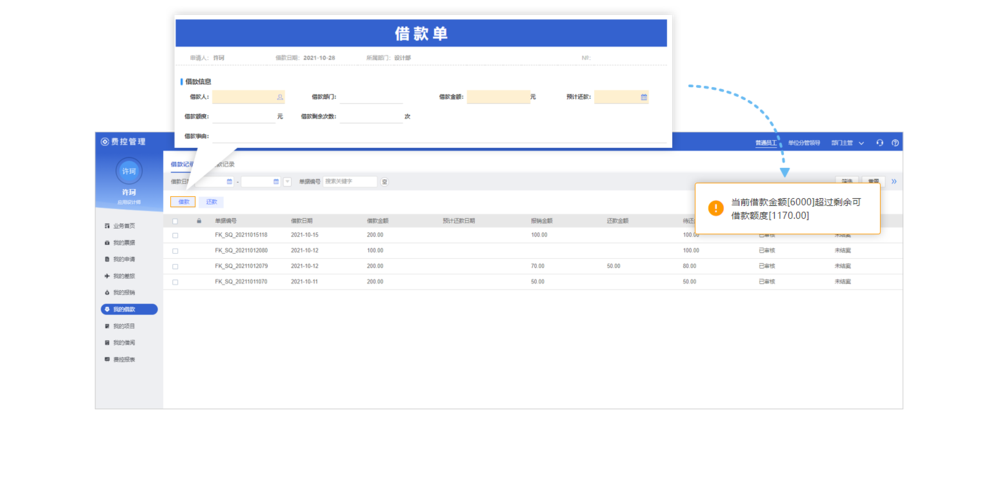 费用申请与预算管理联动,系统会根据预算标准、事前申请、费用标准、借款记录等内容进行自动审核,报销超预算即刻发出提醒,费控标准真正潜入到流程中。