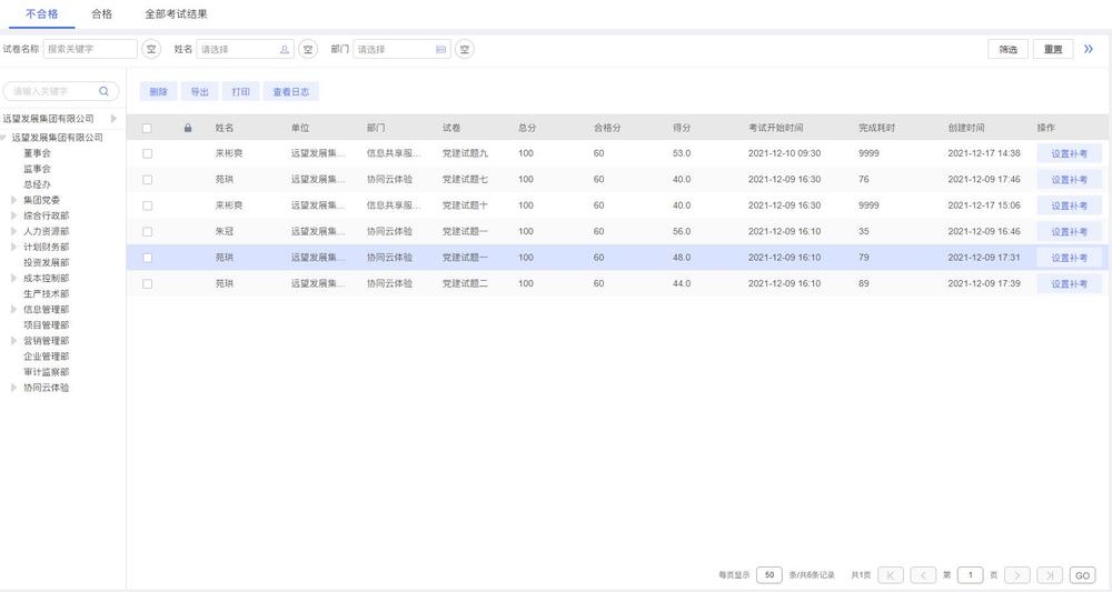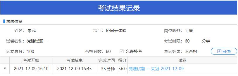 员工考试结束后,自动生成考试结果,考试结果分类展示,且补考记录与第一次考试记录标记不同,领导查阅,方便快捷。
