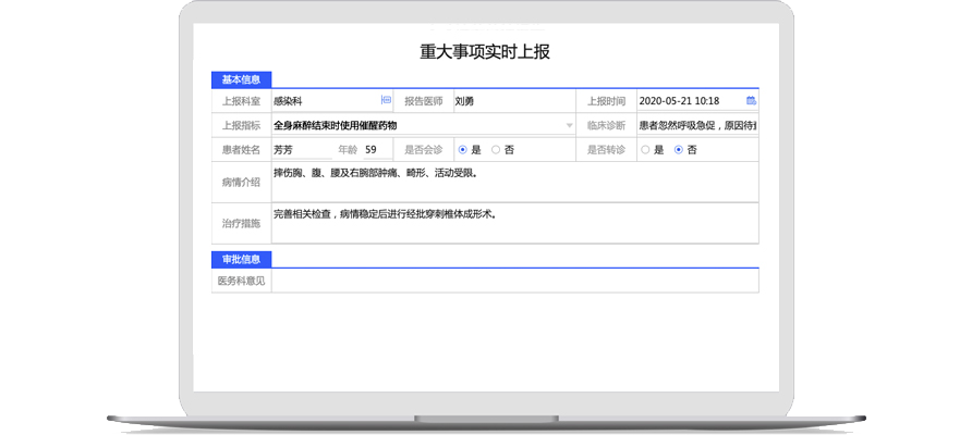 有助于您的医务人员对疑难危重病人、医疗纠纷等重大事项及时上报处理,报告内容准确、规范,方便管理部门智能高效审批,有效降低医院医疗风险。