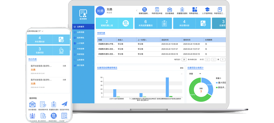 您可以查看包括项目经费使用、人才培养、外来进修考勤、质量整改、医疗纠纷处理等数据,在专属业务门户中按权限图形化展示,方便医务管理相关领导对医务工作开展情况一目了然。